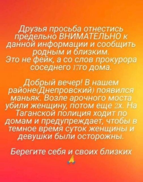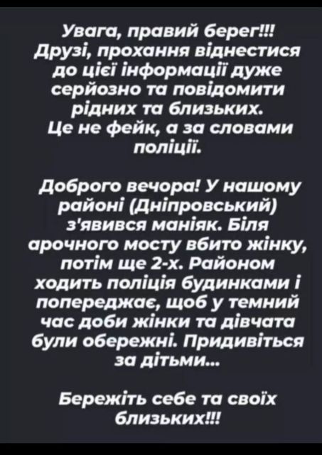 Доброго вечора! У нашому районі (Дніпровський) з’явився маніяк. Біля арочного мосту вбито жінку, птім ще 2-х. Районом ходить поліція будинками і попереджає, щоб у темний час доби жінки та дівчата були обережні. Придивіться за дітьми... Бережіть себе та своїх близьких!!!”