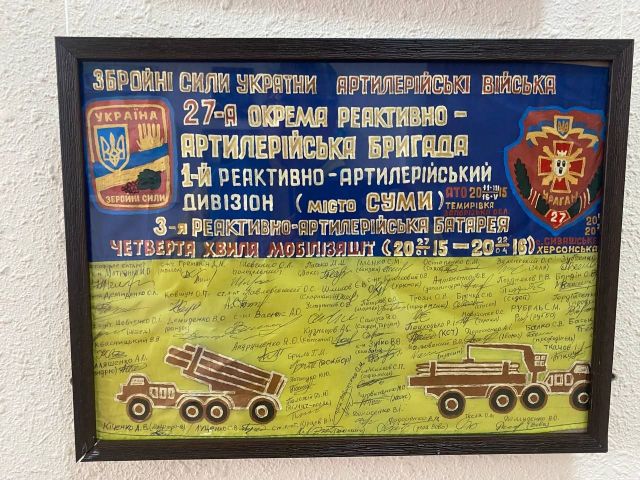 Військові прапори художник творчо оформлює за власною схемою: «Наношу на прапор військову символіку, підбираю гасло — якийсь вірш чи цитату видатного українського діяча. Щось зі своїх робіт роздаровую, щось залишаю у себе». Прапори зберігають найважливіші спогади, - підписи побратимів, що разом боронили Україну».