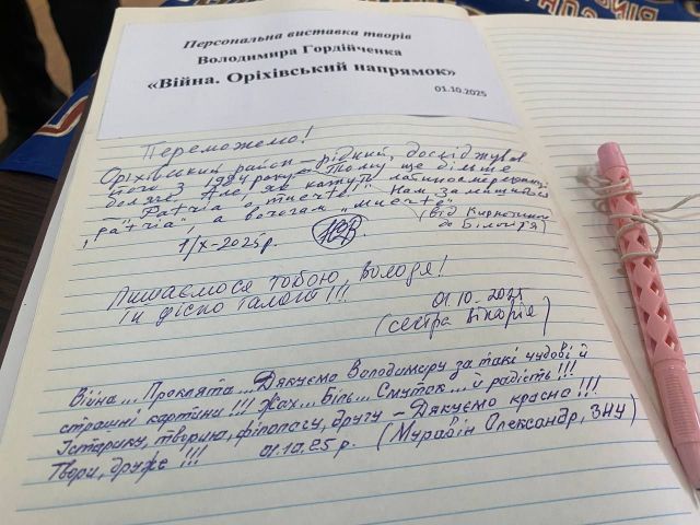 “Я вперше побувала на персональній виставці Володимира Гордійченка. Дуже хвилююча виставка. Роботи вразили — вони чутливі, видно, що автор малював на емоціях. А так як я родом з Оріхова, впізнала багато місцевих краєвидів. Найбільше вразила графічна робота — міст при в’їзді в Оріхів, який був розбомблений, А ще — церква, також зруйнована, будинок культури... Дуже болить, коли дивишся на ці роботи”.