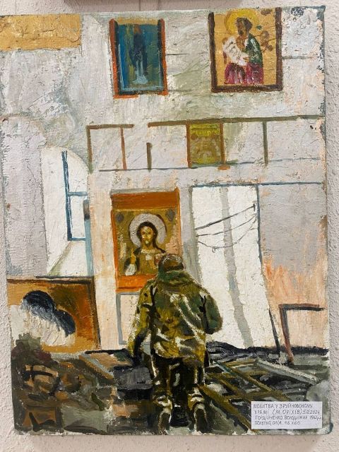 Серед живописних творів, графічних начерків є ноу-хау автора, - ікона Козацька Покрова, розписана на військовому пікселі, та портрет генерала Валерія Залужного в цієї ж техніці. «Я не картини малюю, я пишу історію України», – говорить Володимир.