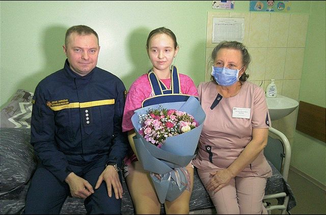 Рятувальник не стримує емоцій — обіймає дівчинку. Поруч стоїть її батько. Дякує і каже, що родина обов’язково запросить його в гості, коли донька повністю одужає.