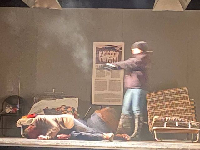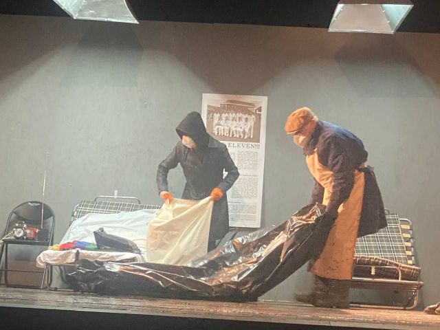 ...Місце вбивства помиють, а два чорних мішка для трупів по черзі художник театру Микола Бірюков протягне на очах глядачів через усю кімнату. Звучить музика Бетховена і - і все, завіса закривається.