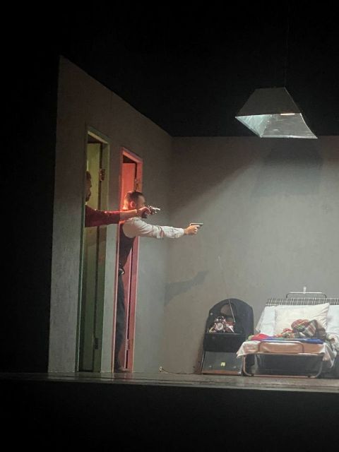 Двоє найманих вбивць, Бен (Андрій Вернер) і Ґас (Андрій Лятуринський), чекають на нове завдання у підвальному приміщенні. Вистава розпочинається німою сценою, яка триває досить довго — щоб глядачі, за словами Віктора Попова, мали час і змогу відійти від життя, яке було до глядацької зали, і переключитися на виставу.