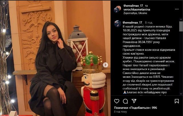 Про трагедію в їхній сім’ї в соцмережах повідомив чоловік Наталії Максим, який розповів, що дружина повністю паралізована та не може самостійно дихати.