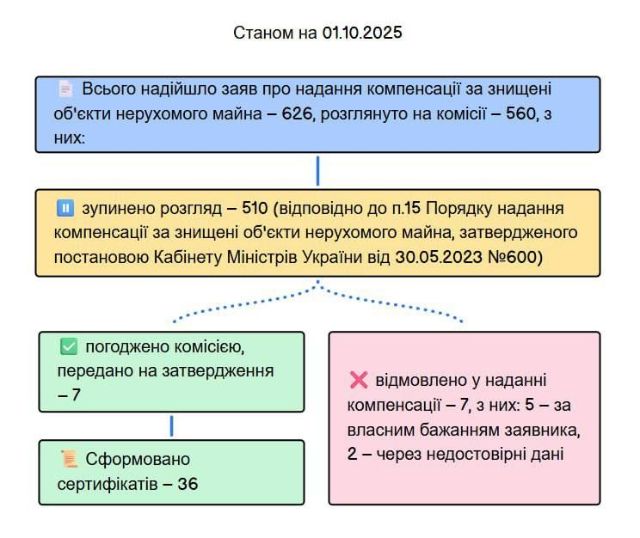Станом на 1 жовтня подано 626 заяв на отримання компенсації за знищене майно
