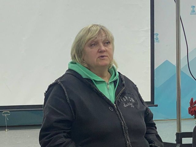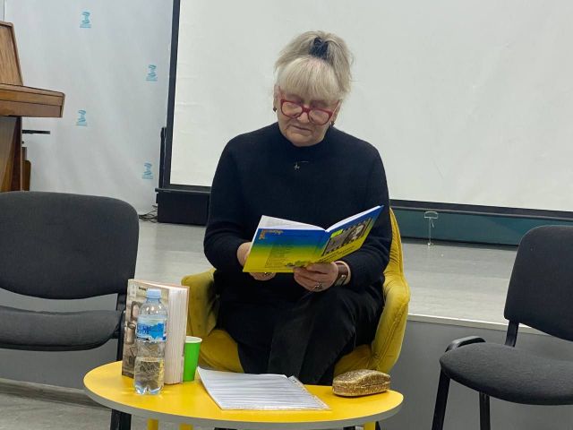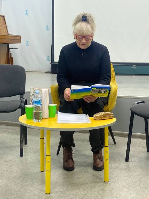 Антоніна Букрєєва прочитала новелу “Господар” - про те, як житель Якимівки на 58-й день війни зірвав рашистський триколор і викинув його у контейнер для сміття. Учасники презентації, до слова, могли переглянути відеосюжет про сміливий вчинок якимівця.