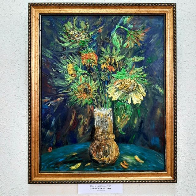 Дизайнерка, екологиня Олена Скуйбіда вперше виставляє в нашому музеї свої твори. Її полотна не лише прикрашають простір, а й впливають на емоції глядача, пробуджуючи у ньому спогади, мрії й тиху гармонію.