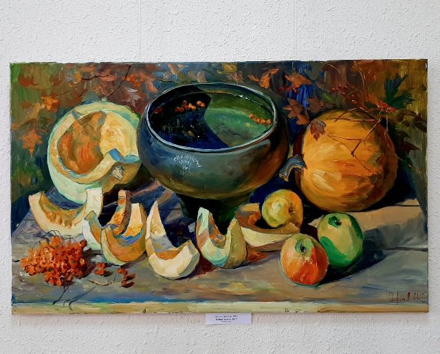 В експозиції - натюрморти, портрети, пейзажі, тематичні картини, а також сувенірні вироби.