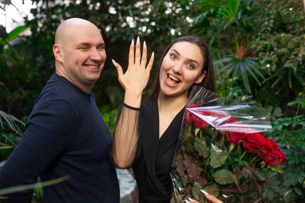 Екскурсовод Ірина Фесенко розповіла, що дівчина з сестрою провела фотосесію у новій оранжереї “Тропікана”, а потім вони перейшли до зимового саду, де на Олену вже чекав Михайло - з колечком і розкішним букетом троянд.
