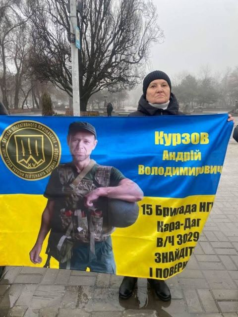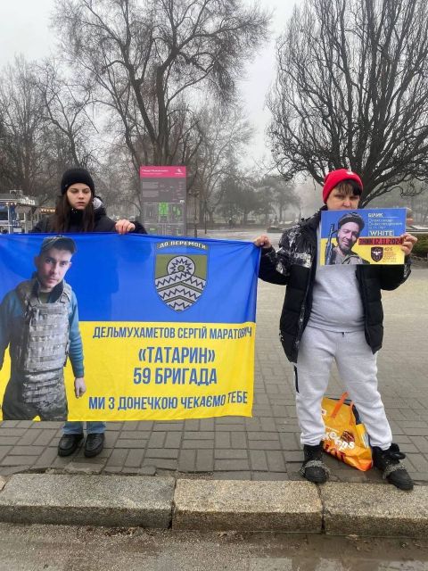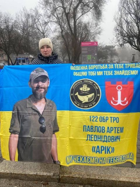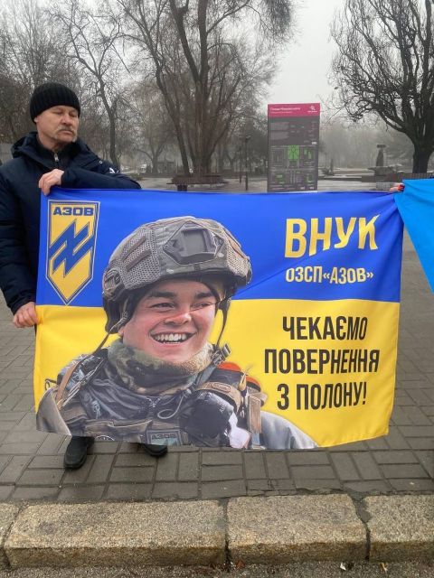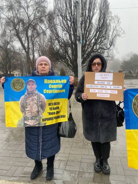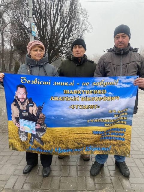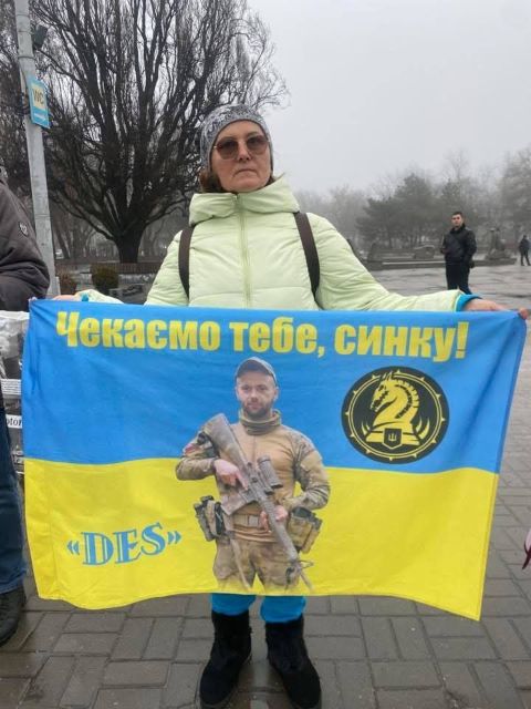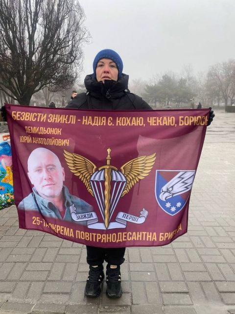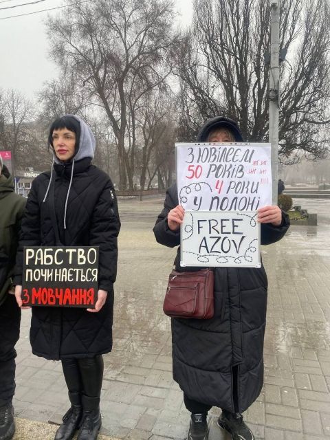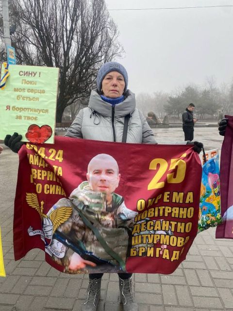 Після відбою тривоги, це якраз закінчилась наша акція, нам дозволили на 10 хвилин вийти на проспект, щоб провести акцію! Разом з родинами ми вийшли нагадати нашій владі та нашому суспільству за полонених та безвісти зниклих, нагадати про «почесний полон», який замість обіцяних кількох місяців розтягнувся вже майже на чотири роки, про оборонців Маріуполя, які з весни 2022 року знаходяться у російських катівнях. Ми вийшли, щоб нагадати про зниклих безвісти.