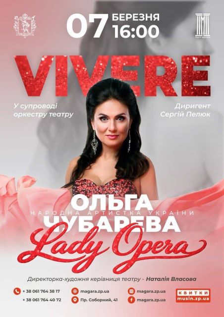 Концерт солістки Національної філармонії України Ольги Чубаревої «Vivere», який відбувся в академічному обласному українському музично-драматичному театрі імені В.Г. Магара, став розкішним музичним подарунком запоріжцям (і особливо запоріжанкам) до свята весни і краси.