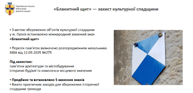 З метою посилення захисту об’єктів культурної спадщини міста Оріхів, пошкоджених унаслідок збройної агресії Російської Федерації, за результатами консультацій з департаментом захисту та збереження культурної спадщини Міністерства культури та стратегічних комунікацій України та на підставі отриманих рекомендацій було видано розпорядження начальника Оріхівської міської військової адміністрації від 12.09.2025 № 275 «Про встановлення знаку «Блакитний щит» на значущих об’єктах культурної спадщини міста Оріхів».