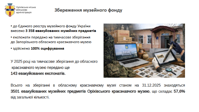 Як зазначається у документі, вагомим результатом роботи у 2025 році стало завершення процесу внесення до Єдиного реєстру музейного фонду України 3 358 евакуйованих музейних предметів зі зруйнованого Оріхівського краєзнавчого музею КЗ «Центр культури і дозвілля» Оріхівської міської ради, які були передані на тимчасове зберігання до Запорізького обласного краєзнавчого музею.
