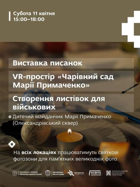 Як повідомляється на сайті Запорізької міської ради, у програмі — творчі майстер-класи, великодні фотозони, мистецькі інтерактиви, виставки писанок та святкова атмосфера, що об’єднує покоління навколо українських традицій.
