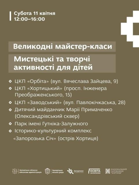 Великодні події для дітей та родин продовжаться 11 і 12 квітня у різних районах Запоріжжя та на острові Хортиця.