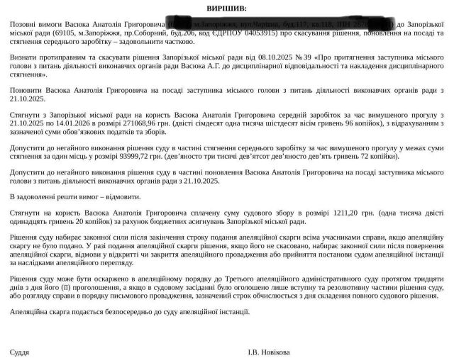 Прогнозовано екс-посадовець знову оскаржив рішення Запорізької міської ради в суді. 11 листопада до Запорізького окружного адміністративного суду надійшов позов Анатолія Васюка до Запорізької міської ради, в якому позивач просив суд визнати протиправним і скасувати рішення міської ради від 08.10 2025 №39 “Про притягнення заступника міського голови до дисциплінарної відповідальності та накладення дисциплінарного стягнення”, поновити його на посаді заступника міського голови з питань діяльності виконавчих органів з 20.10 2025 року та стягнути з відповідача на свою користь середню заробітну плату за час вимушеного прогулу з 20 жовтня по час постановлення рішення.