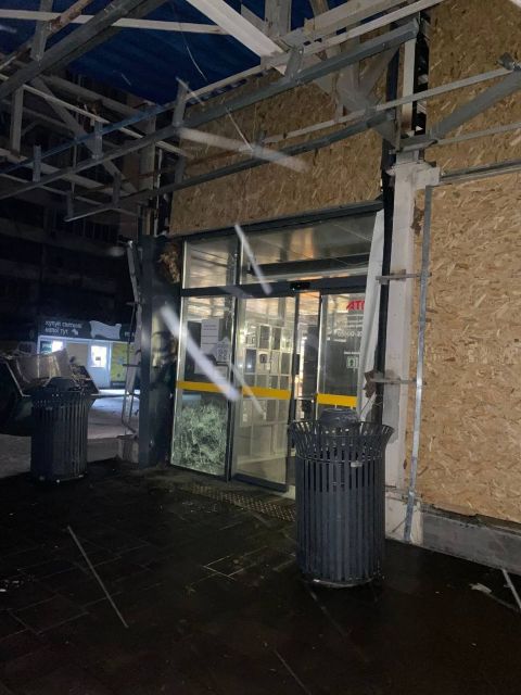 Вже вчора, після завершення оперативно-слідчих дій, супермаркет продовжив роботу. Вибиті вікна забили деревоплитами, скло на дверях вціліло, хоча деяке й зазнало пошкодження
