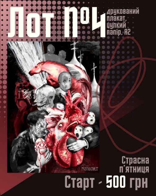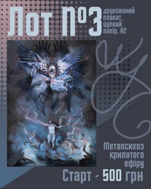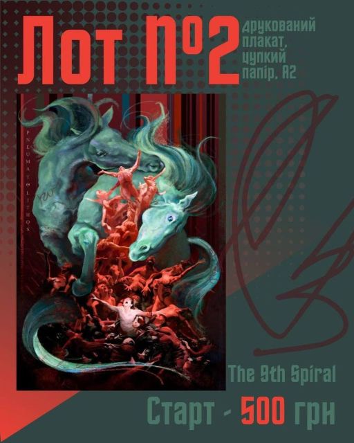 Лоти 2-4 (плакати формату А2): «The 9th Spiral», «Метапсихоз крилатого ефіру», і «Страсна п'ятниця». Стартова ціна кожного - 500 грн.