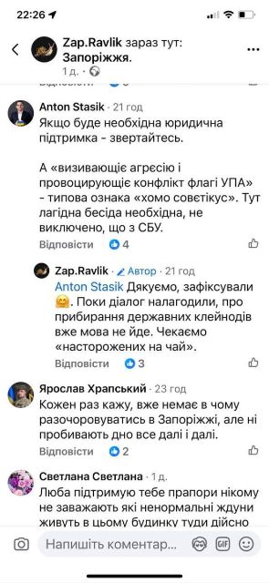 А сьогодні на фейсбук-сторінці "Zap.Ravlik" з’явився допис такого змісту: “Наразі конфлікт вичерпано. Був налагоджений діалог з представниками стурбованої сторони, спокійно обговорили всі питання, в тому числі безпекові.