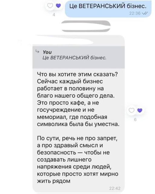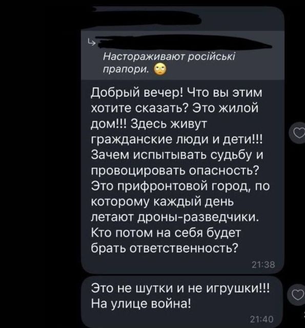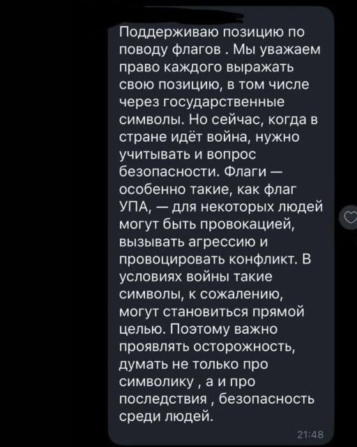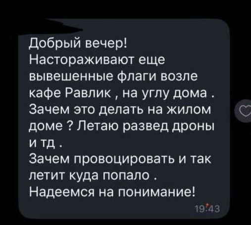 "Ну що, шановні! Довоювалися! У Запоріжжі! У прифронтовому місті, в тилу у наших пацанів, які усіма силами тримають орду, мешканці будинку, в якому розташований наш заклад, вимагають зняти державну символіку, щоб не провокувати ворога!!! Ми завжди за діалог, але вибачаємось, ми не змогли промовчати ! Як Ви вважаєте, це нормально на четвертий рік повномасштабки??? До речі! Відбувається це в річницю створення УПА! Так співпало", - говориться у дописі.