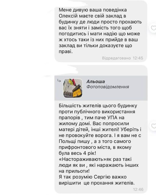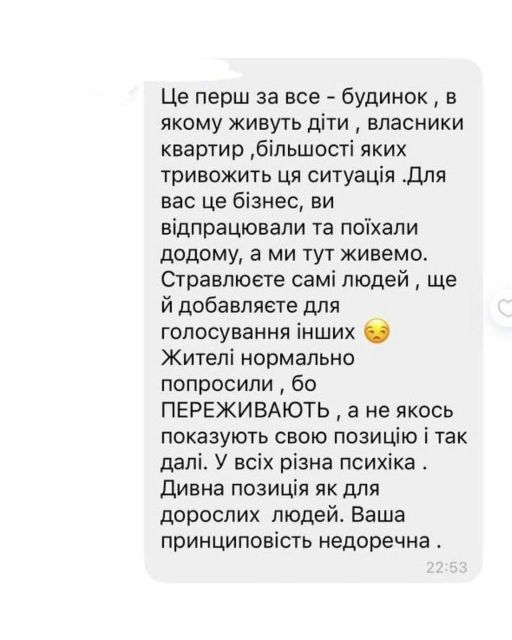 Власник закладу намагався дискутувати з мешканцями будинку, але зрозумівши, що це - марна справа, зробив допис на фейсбук-сторінці "Zap.Ravlik", додавши скріни гарячої дискусії.