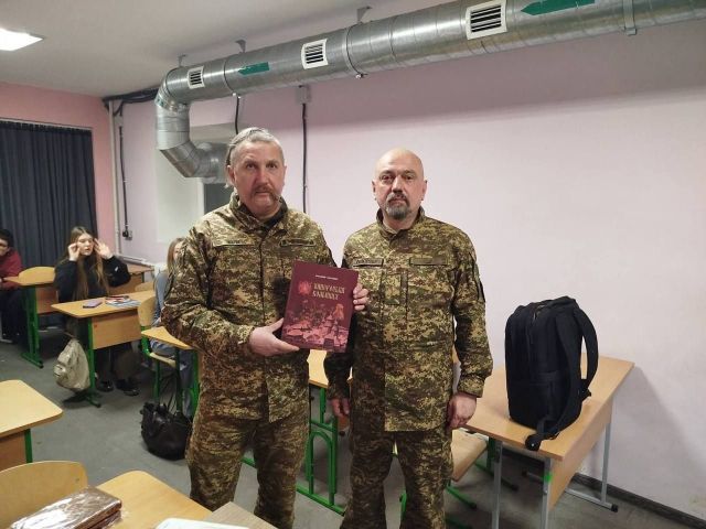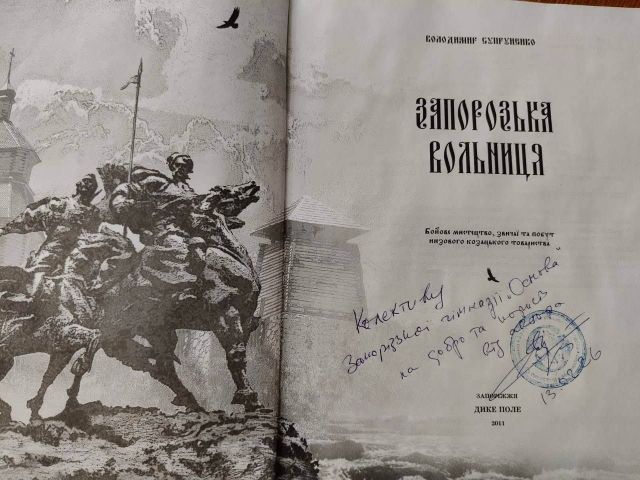 Письменник Анатолій Діхтяр передав колективу школи книжку колеги, знаного запоріжця, відомого мандрівника й письменника Володимира Супруненка «Запорозька вольниця» з авторським написом саме для цього закладу.