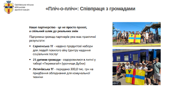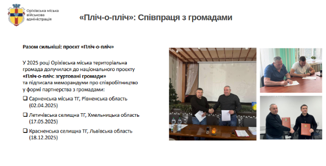 Як нагадав голова Оріхівської МВА Микола Вініченко у публічному звіті про роботу Оріхівської міської військової адміністрації та виконавчого комітету Оріхівської міської ради за 2025 рік, Меморандуми про співробітництво територіальних громад у формі партнерства підписано з: