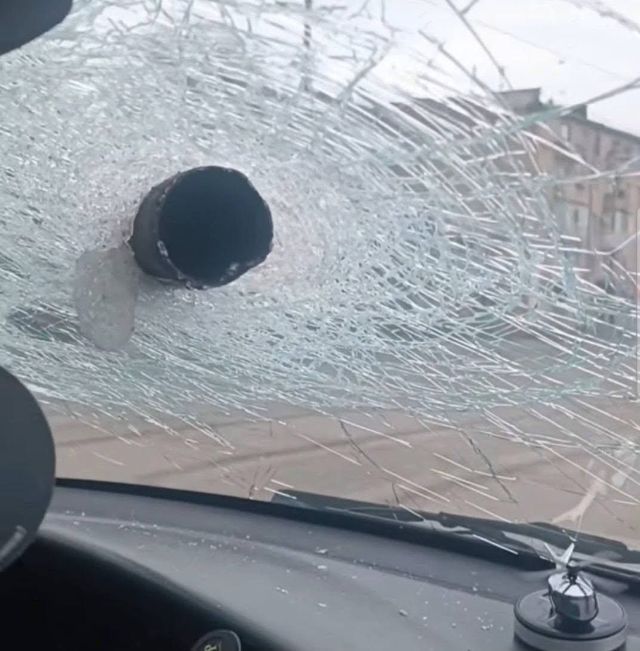 Внаслідок вибуху після однієї з денних атак ударною хвилею у бік авто жбурнуло металеву трубку. Вона пробила лобове скло автівки і застрягла у ньому. В машині були мінімум двоє людей - чоловік і жінка. 20 лютого можна вважати їх другим днем народження...Вони обоє точно народилися в сорочках...