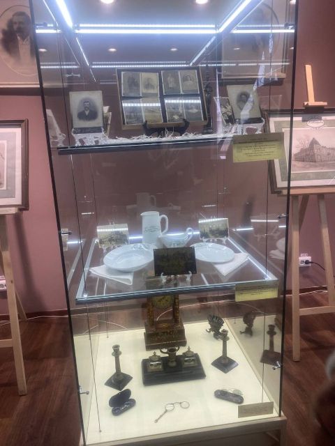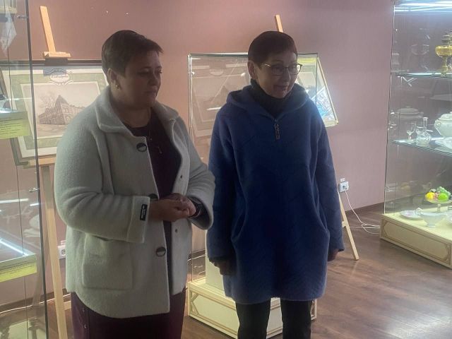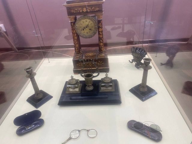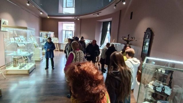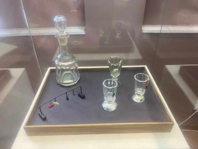 До речі, дуже цікава історія набору з трьох чарок з маленькими фігурками. У зимові вечори представники інтелігенції, чиновники збиралися за ломберним столом і грали в карти. І, звісно, вживали спиртні напої. А щоб не переплутати чарки, вішали на них спеціальні фігурки на гачках. Саме такий автентичний набір і розміщений в одній з вітрин.