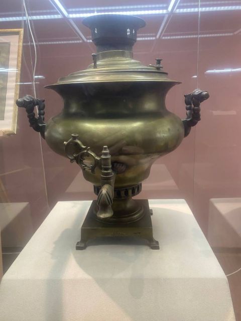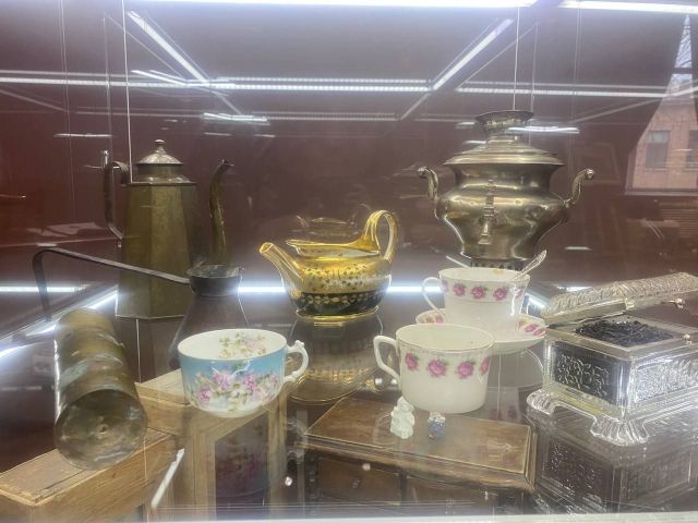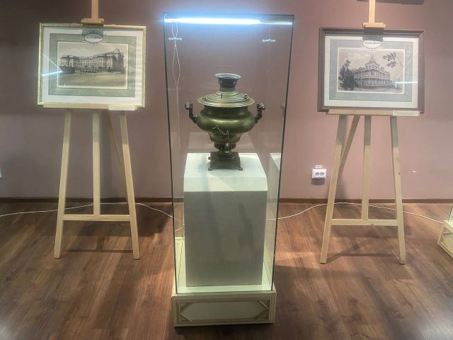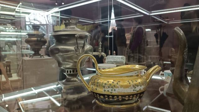 Свого часу у багатьох родинах була традиція збиратися разом біля самовару. На виставці їх два – для великої компанії і для однієї-двох осіб, його називали «Егоїст», або «Тет-а-тет». Поряд – чайні чашки, скляна скринька для зберігання чаю.