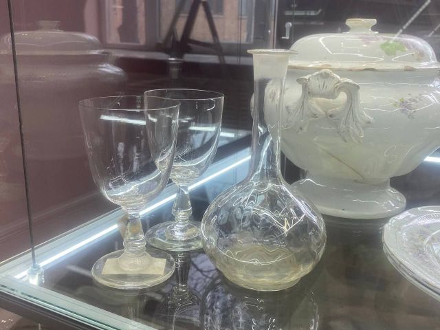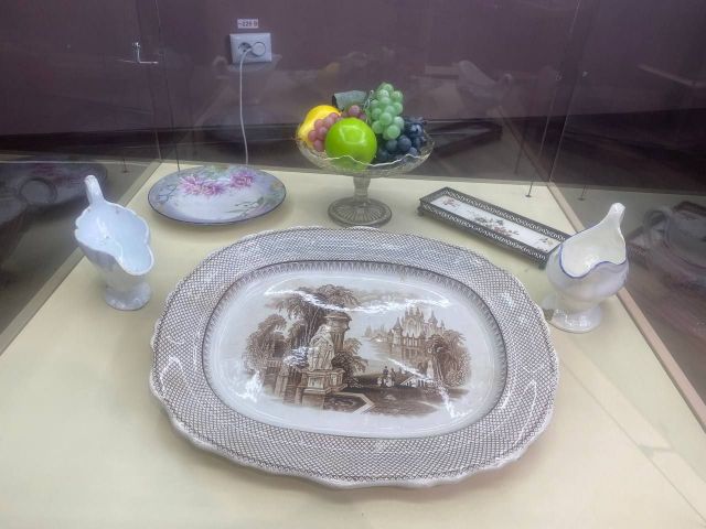 В вітринах можна побачити багато посуду – тарілки, блюда, супник, ваза для фруктів, карафки, чарки.