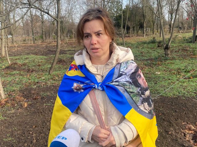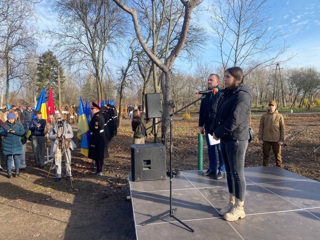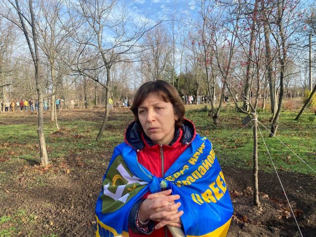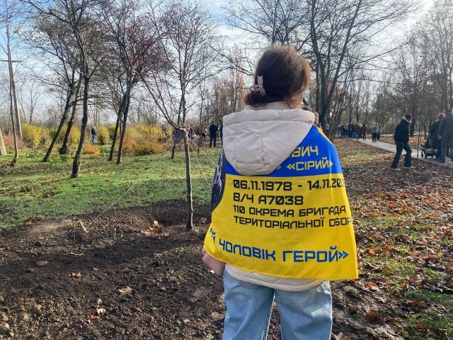 ...Олеся Петрова у цьому парку весною висадила дерево на честь свого загиблого чоловіка Сергія, який загинув 14 листопада 2022 року. Зараз вона прийшла підтримати свою подругу Катерину Леваду.