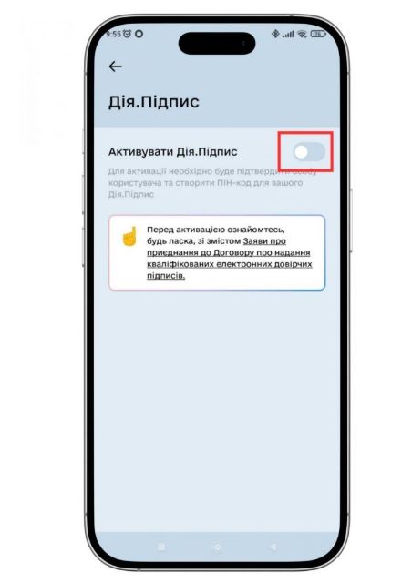 4. Активуйте Дія.Підпис, перетягнувши бігунок праворуч (якщо не активовано раніше). Перед активацією варто ознайомитись зі змістом Заяви про приєднання до Договору про надання кваліфікованих електронних довірчих послуг.