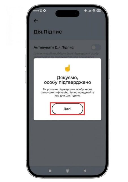 7. Після здійснення цих кроків на екрані смартфона з’явиться запис про успішне підтвердження особи. Придумайте п’ятизначний код для Дія.Підпису (якщо раніше не створювався) та натисніть кнопку “Далі”.