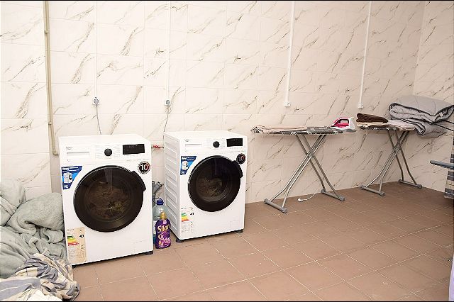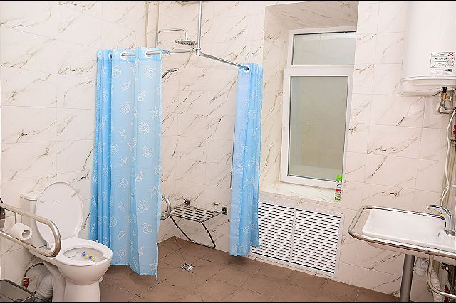 У закладі облаштовано санвузли та душові кабіни. До кожної раковини під'єднано водонагрівачі, щоб люди завжди можливість помити руки теплою водою. Також є кімната для прання та прасування одягу.