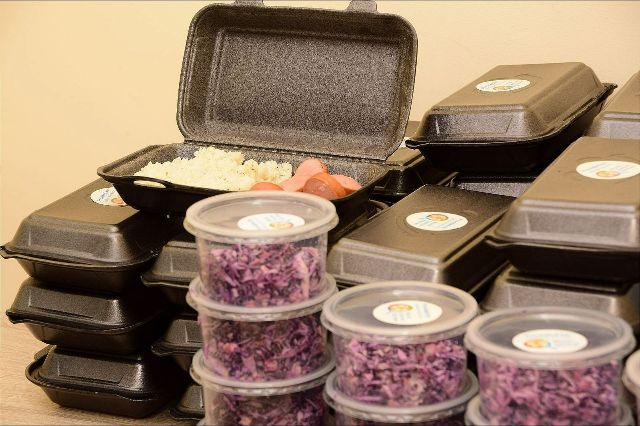 Проживаючим надають триразове харчування. Якраз під час нашої розмови до центру привезли порції обіду. На цей раз був рис з сосисками та салат з капусти. Працівники накрили в їдальні столи та покликали людей обідати.
