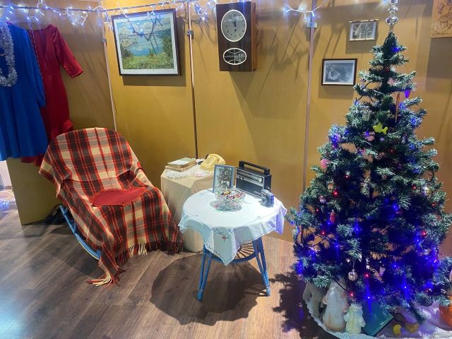 Музейники облаштували затишний куточок біля ялинки, у якому розмістили стареньке кресло-качалку, вкрите пледом, стаціонарний телефон і телефонний довідник, транзистор, фотоапарат, старовинний годинник, новорічну листівку з привітанням і кришталеву вазочку з цукерками (кришталь був показником достатку родини, правда, вазочки й бокали купити в умовах суцільного дефіциту було практично неможливо).