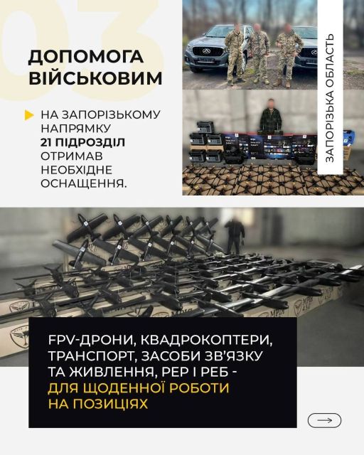 Кожна гривня - це потужні гексакоптери, FPV-дрони, автівки, засоби живлення та звʼязку. Все це вже допомагає нашим військовим протистояти ворогу та тримати рубежі Запорізького фронту