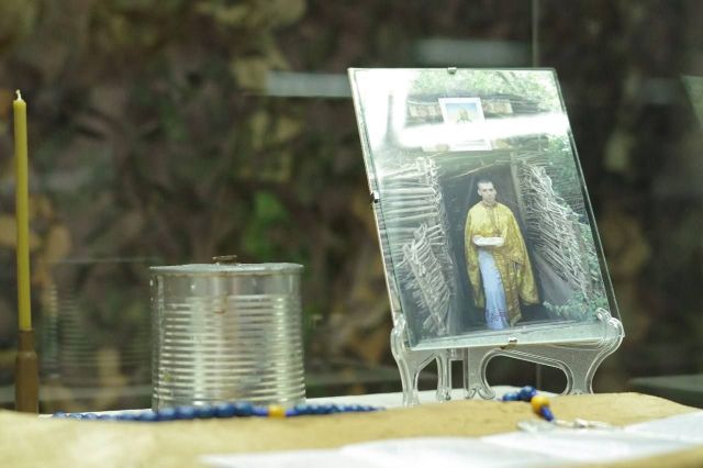На виставці головний акцент зроблено на велику ікону на фоні великого синьо-жовтого стяга, який сьогодні покриває та захищає всю нашу країну.